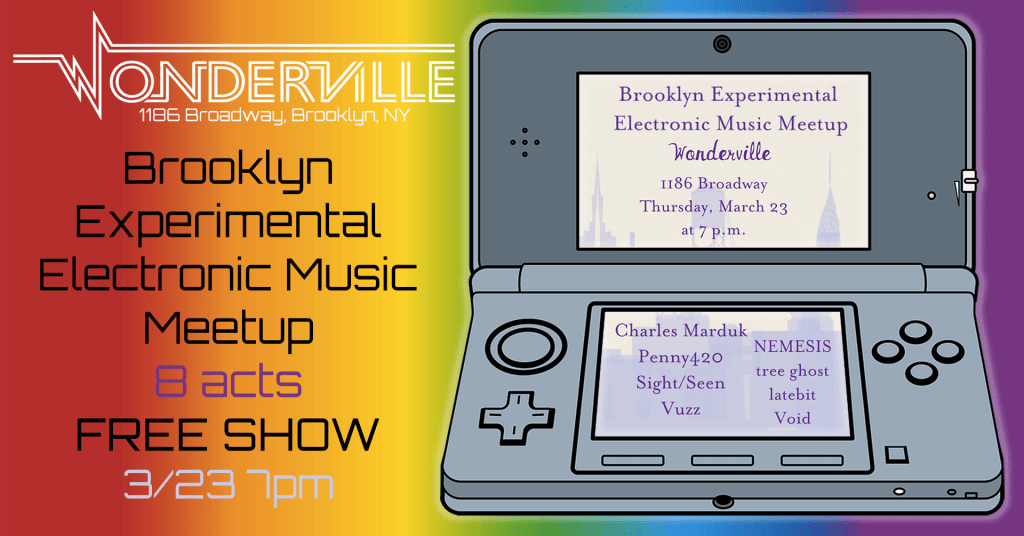 Eight acts will perform at this month’s Brooklyn Experimental Electronic Music Meetup at Wonderville, a barcade with over 20 stand-up game consoles featuring indie games. NO COVER. Come drink, game, and network with New York’s brightest up-and-coming (and established) experimental electronic musicians. Playing: CHARLES MARDUCK, PENNY420, SIGHT/SEEN, VUZZ, NEMESIS, TREE GHOST, LATEBIT, and VOID. 21+ https://fb.me/e/4w6dP6Ppg