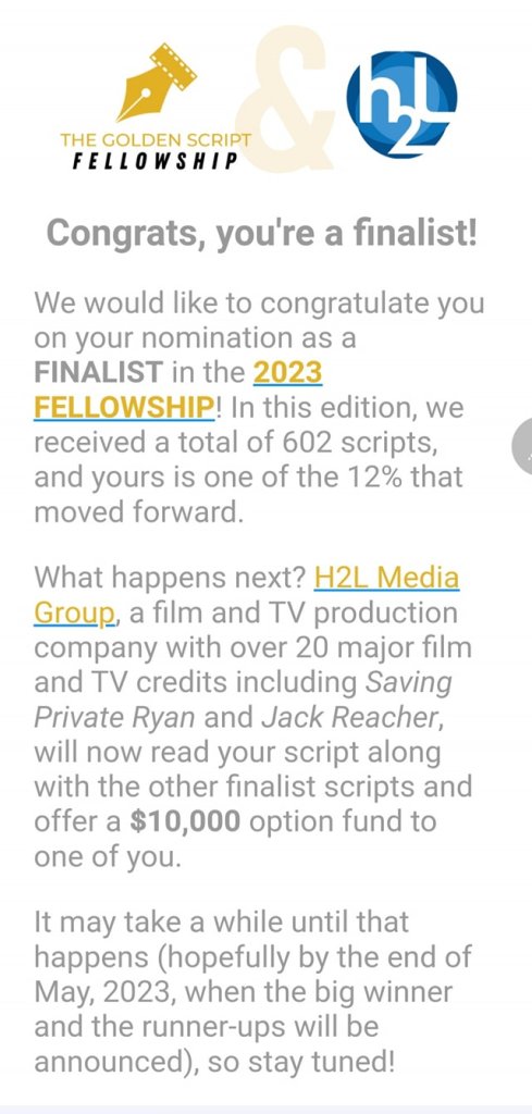Exciting Finalist placement for Boo, my supernatural thriller set in Post-Katrina New Orleans. Thank you, Golden Script Fellowship for seeing the value in this spec script. Go Boo! Now how do I get Anthony Mackie to bring this story about parenthood, loss, and gentrification home!