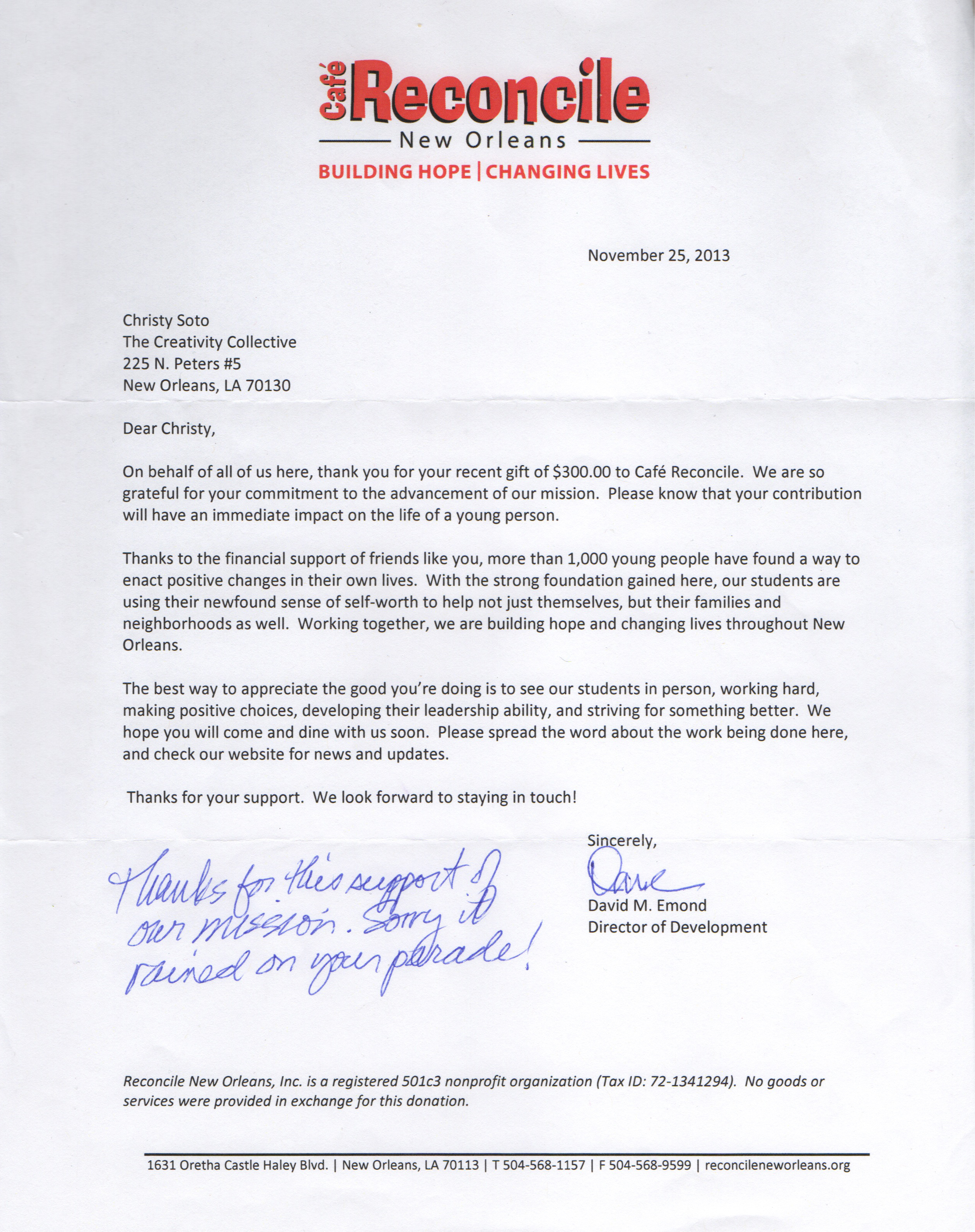 - Raised $300 for Cafe Reconcile, a culinary arts program for at-risk teens and young adults.